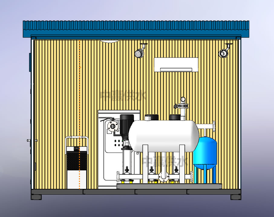 2、一體化智慧泵房將供水機組、電氣控制系統、安防系統、水質監測系統、遠程監控系統、流量監測設備、消毒設備、空調和除濕設備等集于泵房之內,泵房功能。